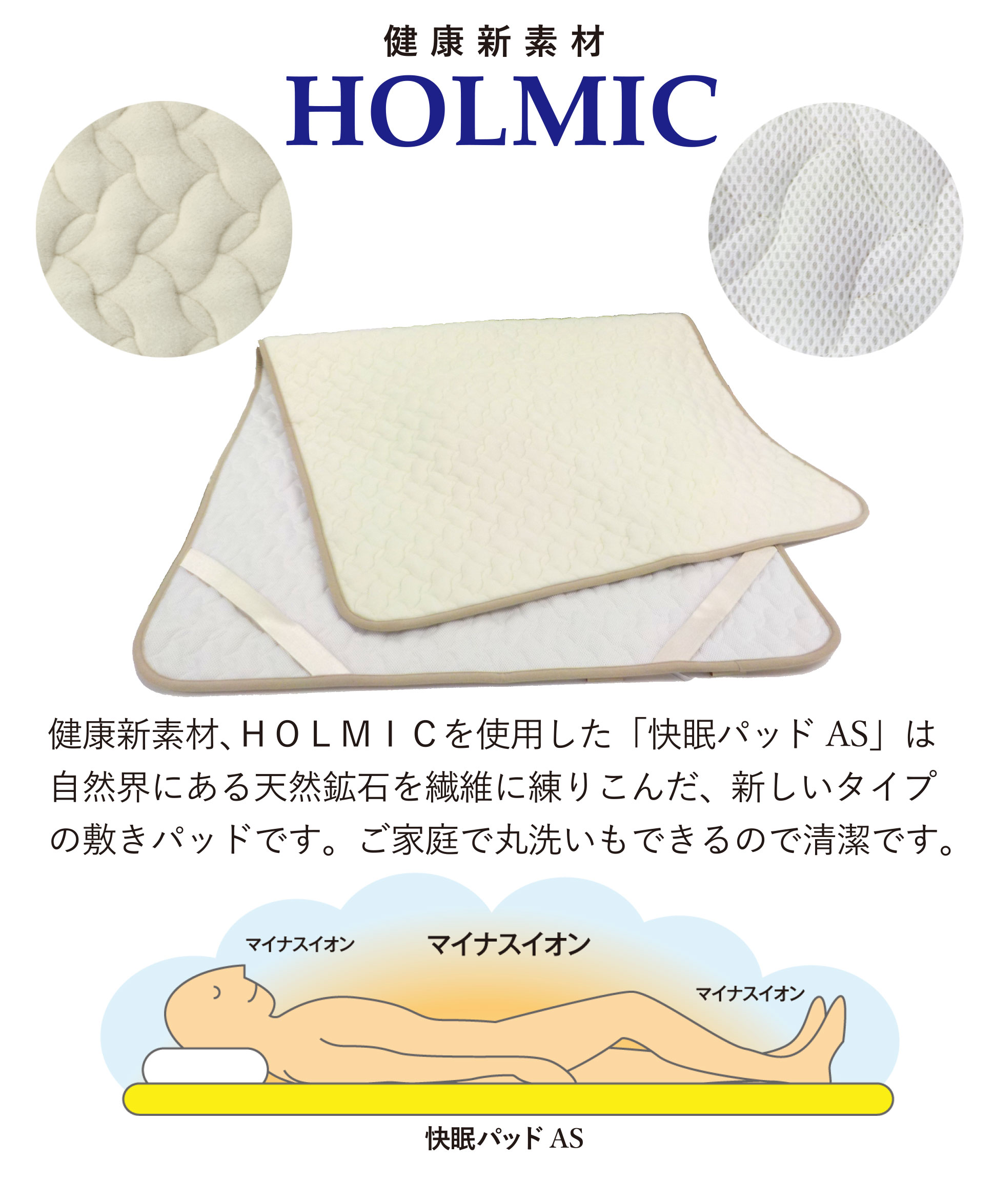 快眠パッドASは健康素材ホルミックシートを使用し国内工場生産の非常にしっかりした造り。表地は肌触りの良いEウール100%パイル地。裏地は涼しく、さわやかなハニカム地を採用しました。ご家庭で丸洗いできるので、シーツをかけずにそのままでご使用いただけます。