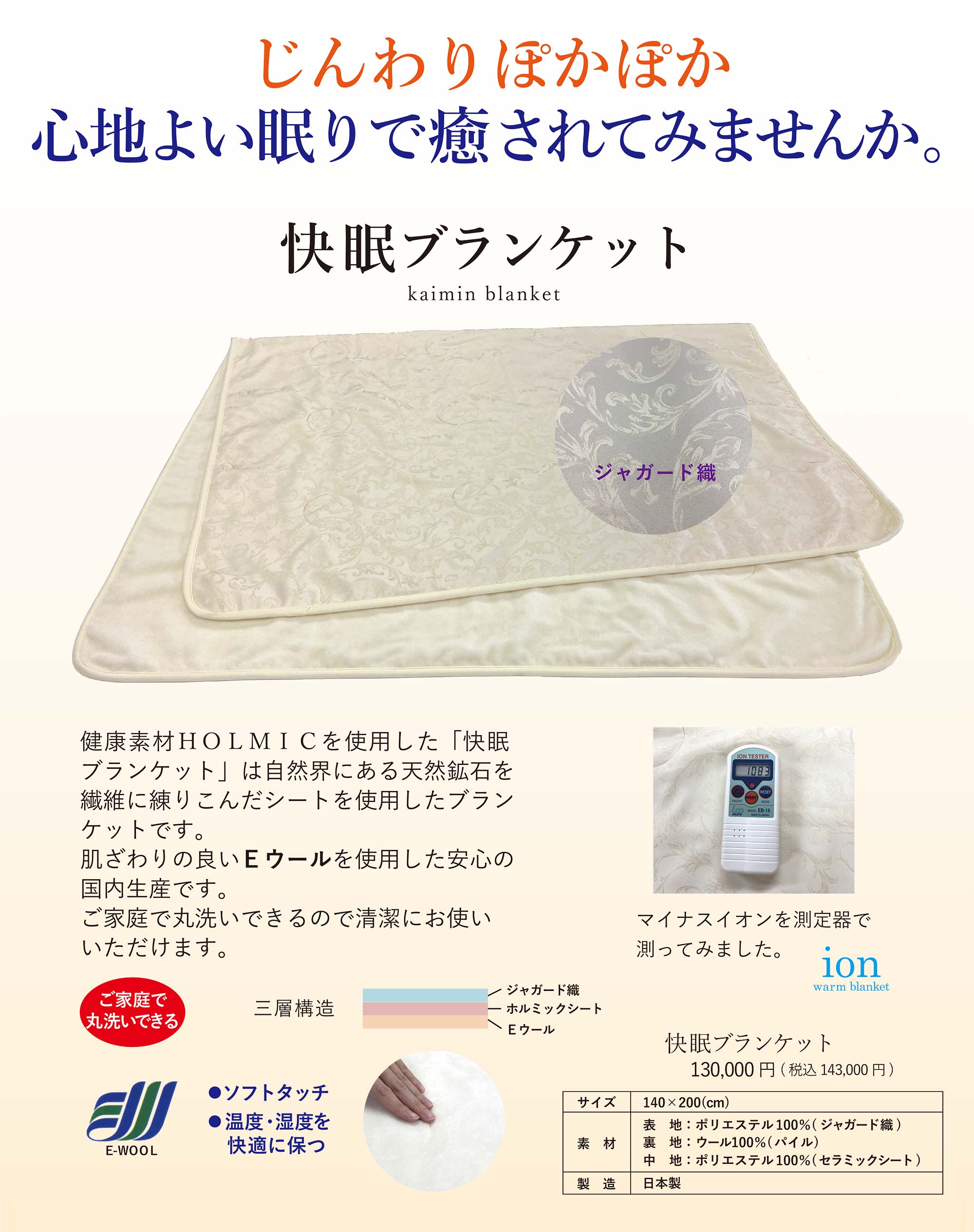 健康素材ホルミックシートを使用した快眠ブランケットは自然界にある天然鉱石を繊維に練りこんだシートを使用してます。肌に触れる裏地は肌触りの良いEウールを使用した安心の国内工場生産です。ご家庭で丸洗いできるので、清潔にご使用いただけます。