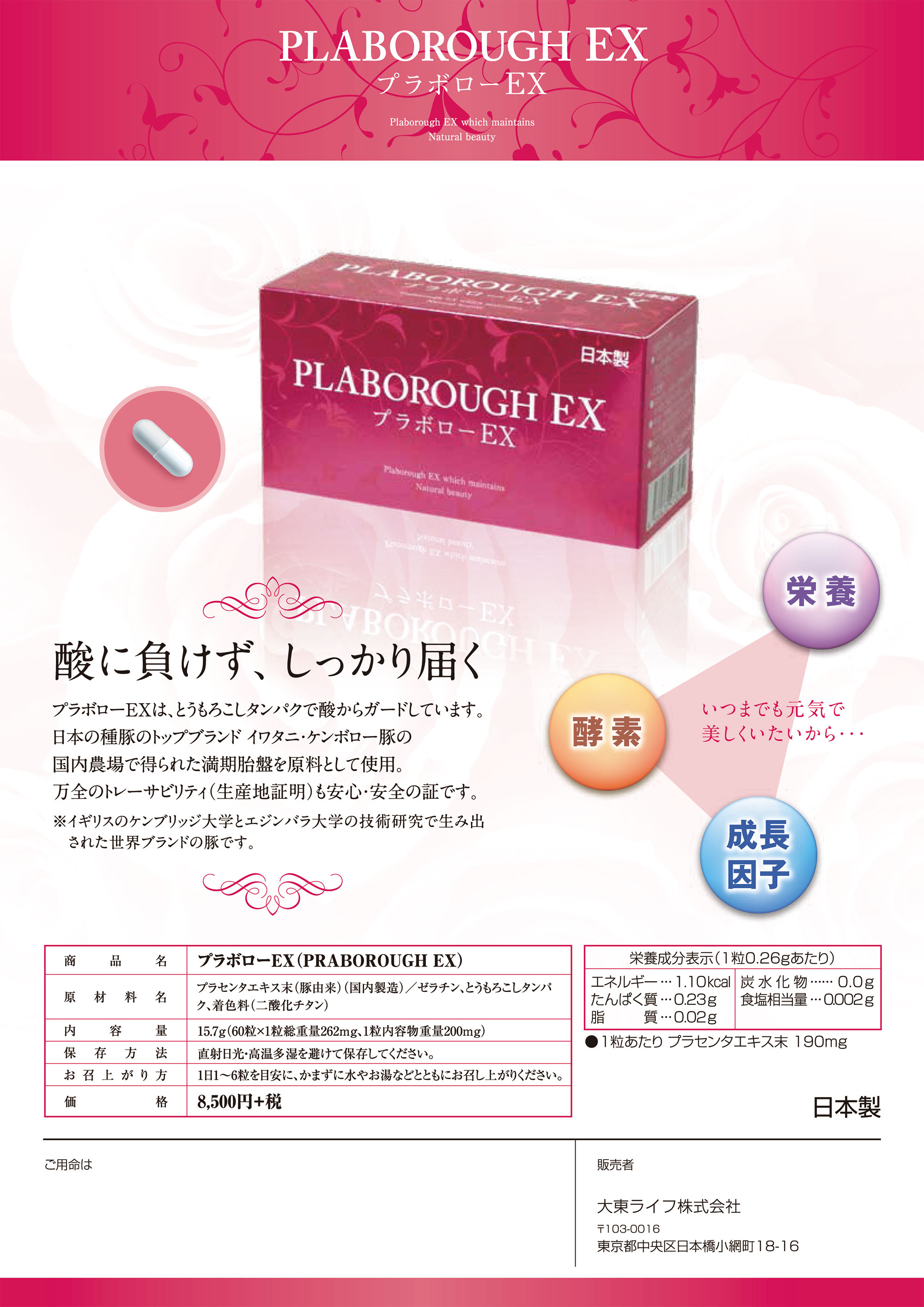 | 原材料名 | プラセンタエキス末(豚由来)(国内製造)/ゼラチン、とうもろこしタンパク着色料(二酸化チタン) |