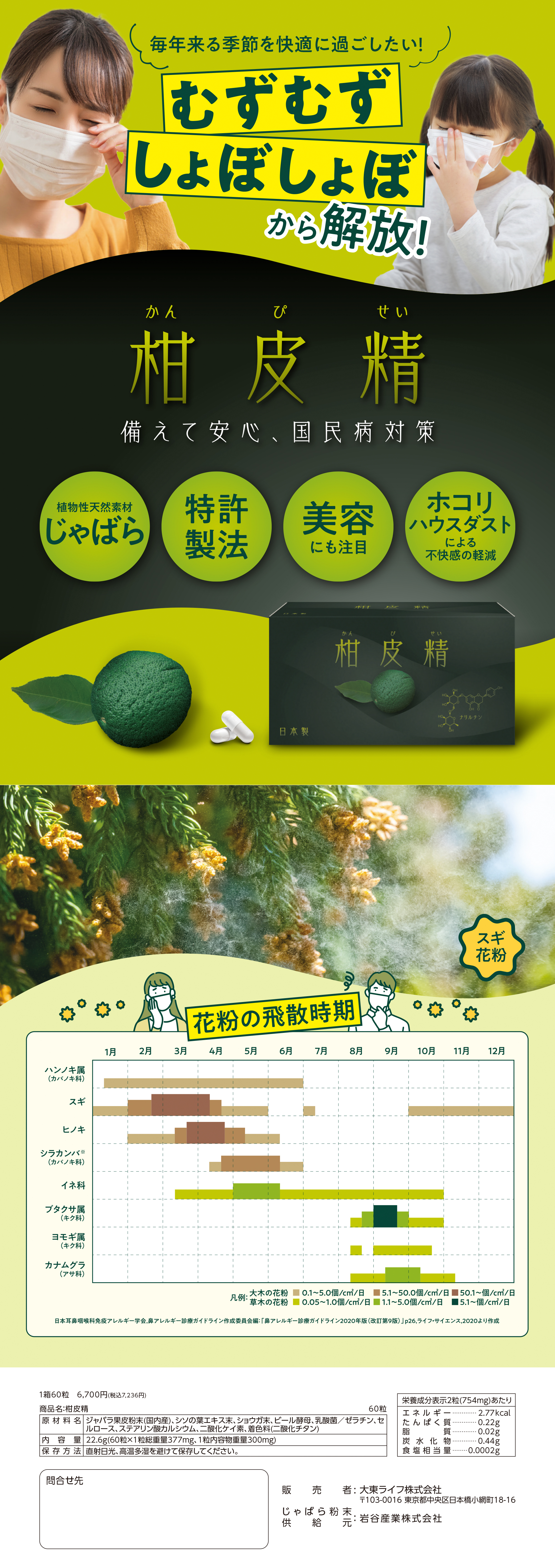 柑橘類の一種である「ジャバラ」を特許製法で粉末化しました。注目の成分ナリルチンが他の柑橘類よりも多く含まれています。備えて安心、あなたの「むずむず、しょぼしょぼ」に!