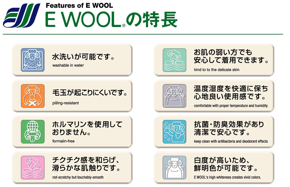 ※独自製法のEウールは、びっくりするほど肌触りが良く、またご家庭で丸洗いできるのでいつも清潔にお使いいただけます。