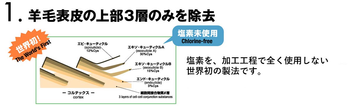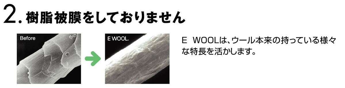 世界的に行われているウールの防縮加工のほとんどに、塩素が使われています。 Eウールは塩素を一切使用せずに加工された防縮ウールで、樹脂被膜もしていません。 私たちの素肌にも地球にも優しいエコ防縮ウールなのです。