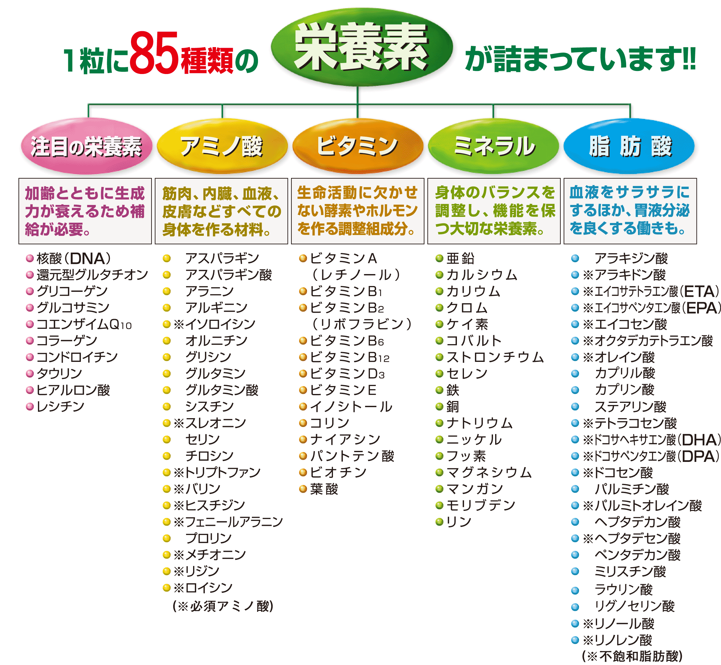 | 内容量 | 84.0g (1粒の重量700mg、1粒中の内容量500mg)×120粒 |